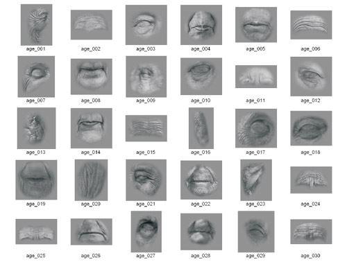 Die Elemente enthalten unter anderem: Augenlider, Fingerabdruck, Stirnpartie, Lippen, Muskel, Nasen, Narben, Wunden, Kratzer, Falten sowie eine große Anzahl Hautpartien mit Poren und Falten für Stirn, Genick, Kinn, Augenpartie etc.